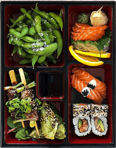 Beef Yakitori 2 Gyoza Deep Fried Veg 2 Edamame Beans Salmon Nigiri 2 Salmon Sahimi 2 Salmon Avocado Uramaki 4